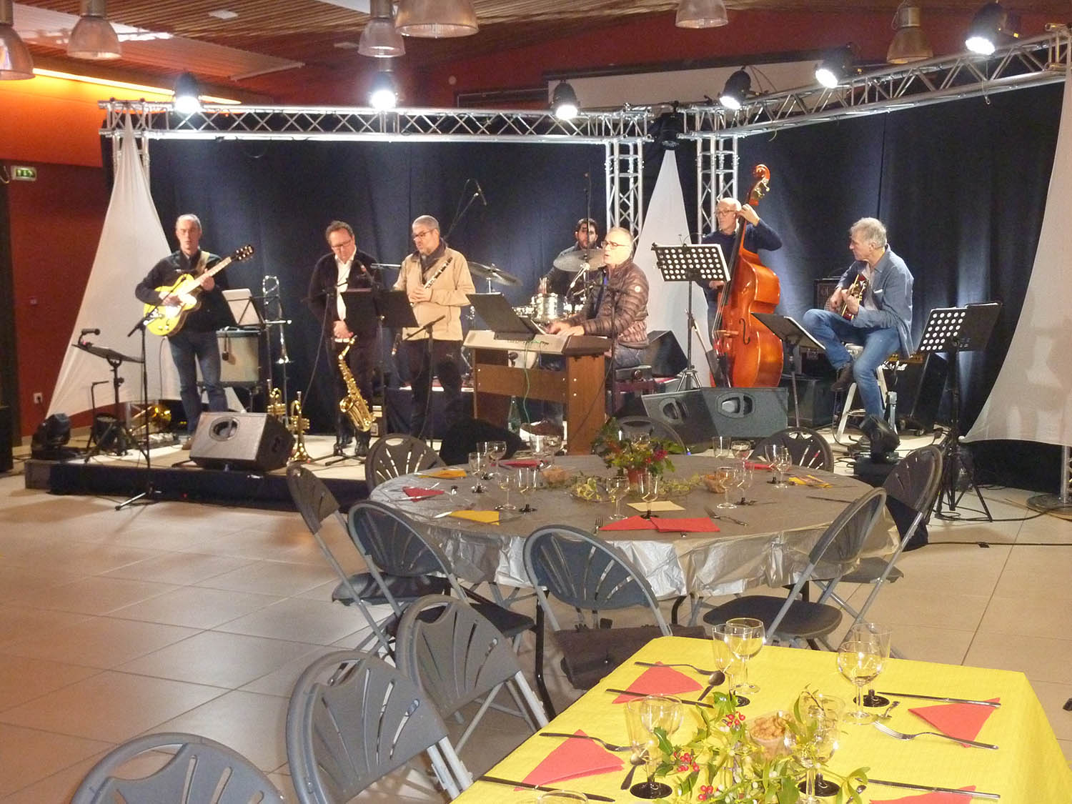 Dans la salle de la Maison des associations, samedi 24/11/2018, la soirée cabaret a connu un franc succès. Plus de cent participants se sont retrouvés autour des tables, pour partager un repas dans une ambiance musicale, assurée par le groupe Séneçon, dirigé par Frédéric Grolet. Sur scène, l’expérience de cette formation composée de sept musiciens a transporté le public, avec un programme d’une très grande qualité. Des couleurs sonores ont jailli avec de belles envolées de rythmes et de mots influencés par Paolo Conte. Le tout, savamment mis en valeur par un jeu de lumière sobre mais efficace, par Techni’ Scène. Indéniablement, une soirée simple et détendue.